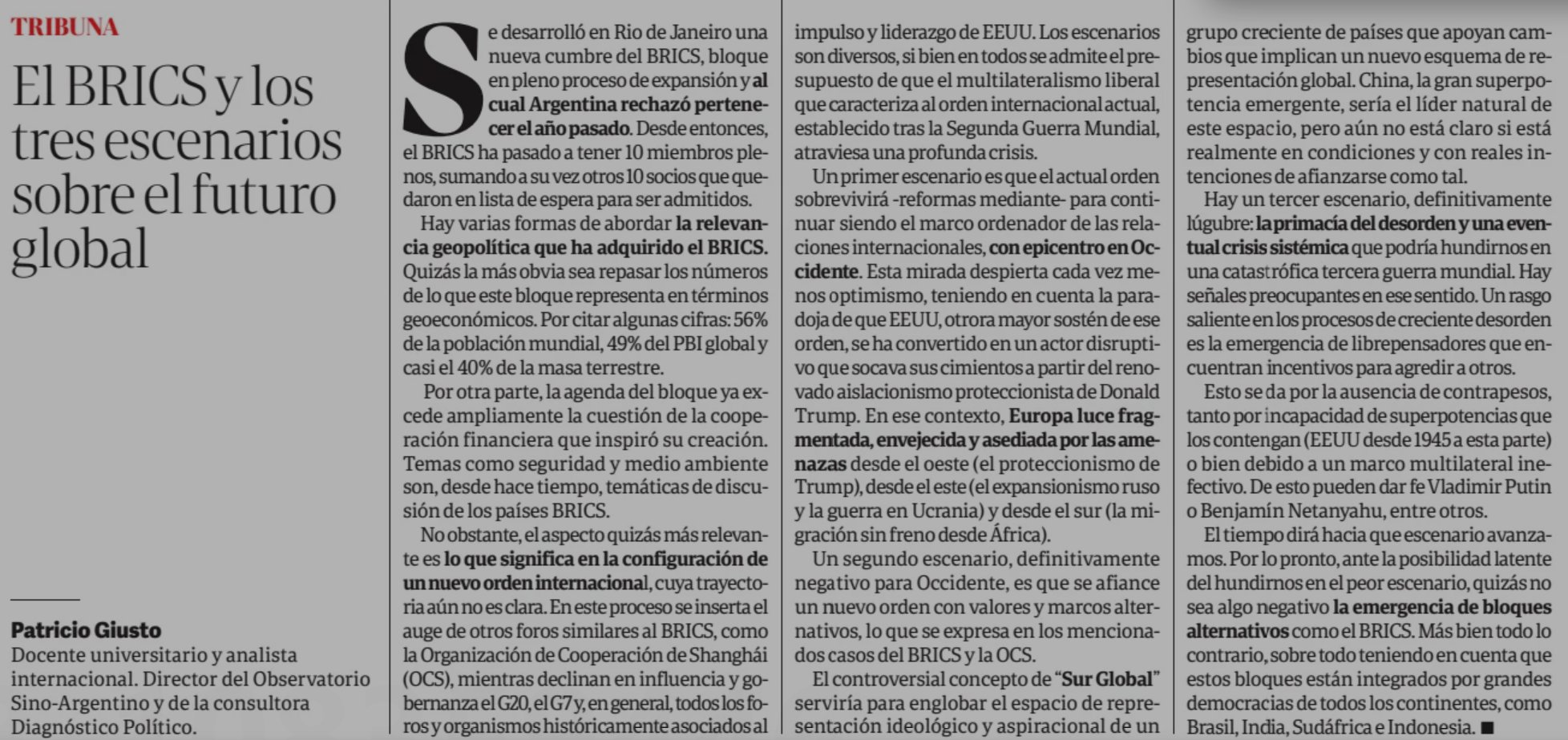 Columna de Giusto en Clarín: el BRICS y los tres escenarios sobre el futuro global